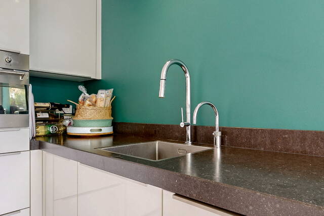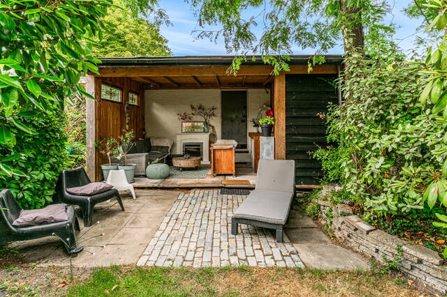 Through French doors or the kitchen door you reach the deep, northwest-facing backyard, approximately 14 meters deep, with a cozy canopy/veranda and storage room. A wonderful place to enjoy the outdoors all year round. From the roof there is also access to the separately offered garage.