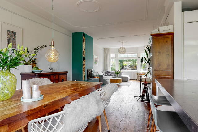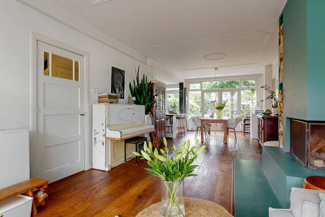 Through the spacious and sunny front garden you reach the vestibule with wardrobe, meter cupboard and characteristic stained glass windows. The hall gives access to the modern toilet, a practical stair cupboard and the spacious living room with open kitchen. The extended living room of approximately 40 m² is light and attractive, with a bay window, sleek plastered walls and ceilings with subtle mouldings, a beautiful wooden floor and a fireplace. The open kitchen with beautiful cooking island forms the heart of the house and is directly connected to the dining area. The kitchen is fully equipped with, among other things, a 6-burner gas stove with large oven, stainless steel extractor hood, dishwasher, refrigerator, Quooker and combination microwave.