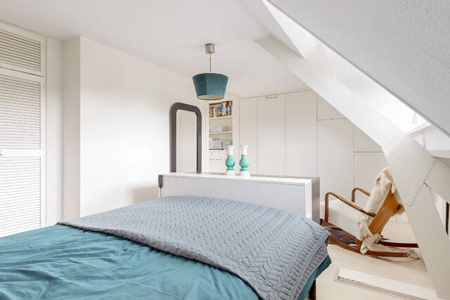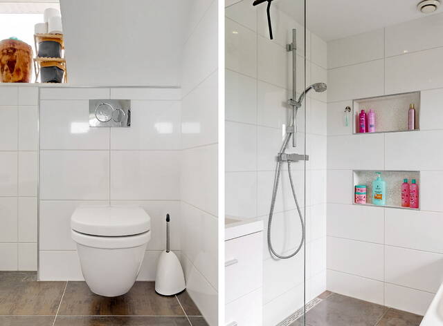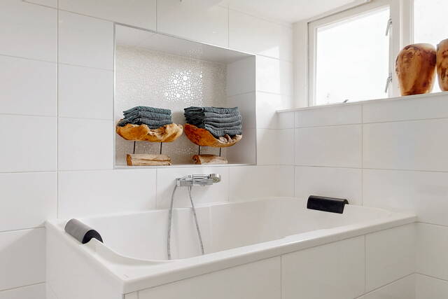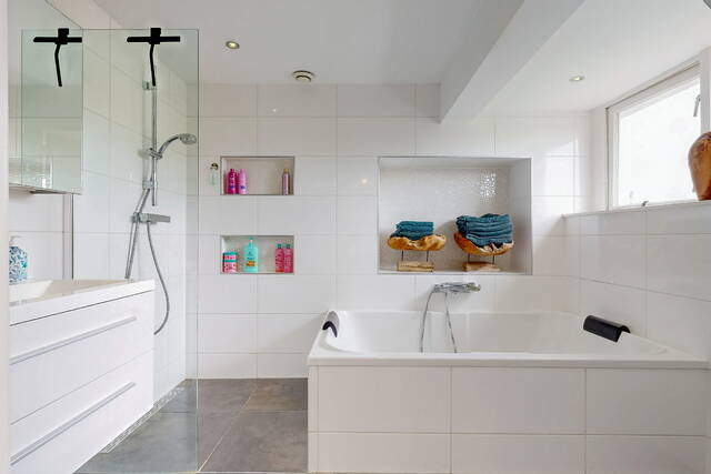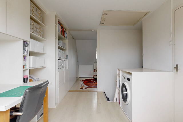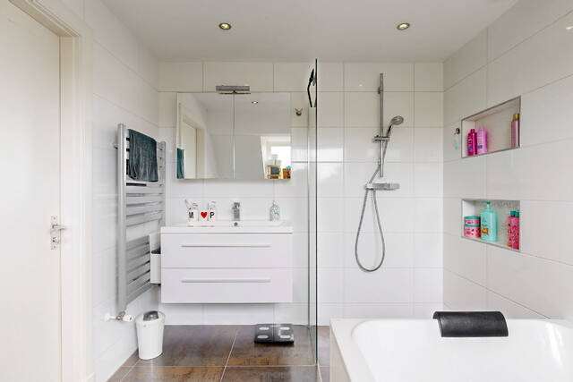 The staircase leads to a spacious landing with skylight, laundry room and a practical workplace with fixed cupboard wall. Here is also a spacious bedroom with dormer window and plenty of storage space. The second modern bathroom has daylight and is equipped with a third toilet, a spacious double bath, a walk-in shower, washbasin with mirror cabinet and design radiator. The spacious attic is accessible via a loft ladder.