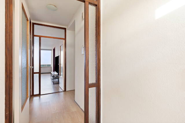 Het balkon strekt zich over de achterzijde van de woning en is toegankelijk vanuit de woonkamer, waardoor u heerlijk kunt genieten van de zon, het uitzicht en de frisse lucht. Door de ligging op de 10e etage ervaart u een gevoel van ruimte en vrijheid, met een schitterend panorama over de stad en het omliggende groen.