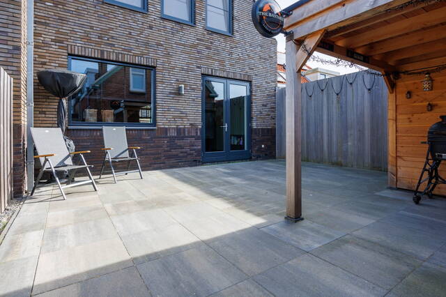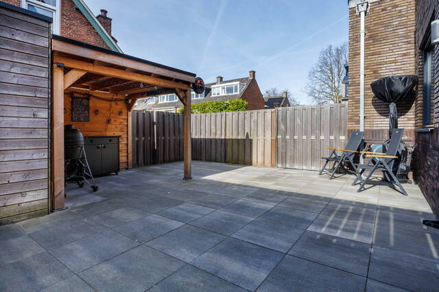 De zonnige achtertuin op het zuidwesten is mooi aangelegd en heeft een veranda voor warme en/of koude dagen. De berging is bereikbaar via de tuin én via de oprit.